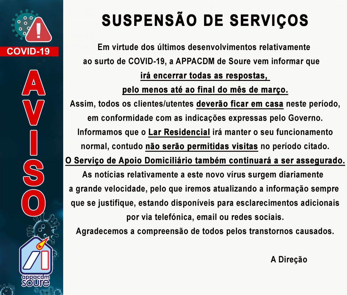 Em virtude dos últimos desenvolvimentos relativamente ao surto de COVID-19, a APPACDM de Soure vem informar que irá encerrar todas as respostas, pelo menos até ao final do mês de março.