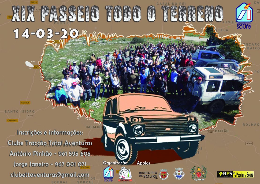 No próximo dia 14 de Março, em estreita colaboração com o Clube Tracção Total Aventuras, a APPACDM de Soure organiza o XIX Passeio de Todo o Terreno. Um dia único, pleno de emoção e adrenalina, que não deixa ninguém indiferente.